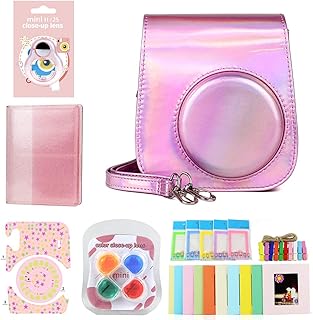Funnideer 保護ケースチェキ Fujifilm Instax Mini 11 インスタントカメラに対応 ケース バッグ - プレミアムビーガンレザーバッグカバー 取り外し可能なストラップ付き, カメラケース アクセサリー 7点セット (M11-7&1-Laser (Pink))