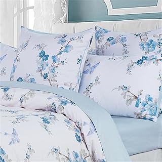 Brandreamホームコレクションヴィンテージ植物花プリント床敷き 400tc コットン 綿織物 ロマンチック 花柄 掛け布団 3個セット(ツイン、ホワイト) 3pc-Queen ブルー