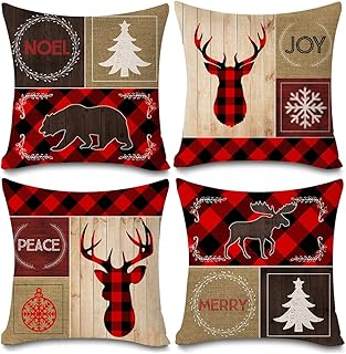 KACOPOL クリスマス バッファロー 格子柄 鹿 クリスマスツリー ファームハウス トラック ノエル 枕カバー コットン リネン スロー 枕カバー クッションカバー 18インチ x 18インチ 4点セット クリスマスデコレーション 18 X 18 Inches
