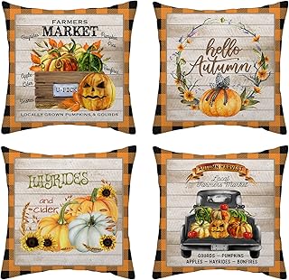 Sinpooo ハロウィン パンプキン スローピローカバー 4枚セット バッファロー格子柄 トラッククッションケース コットンリネン 秋 収穫 感謝祭 装飾 ファームハウス 枕カバー クッションカバー 正方形 18インチ x 18インチ