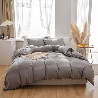 掛け布団カバー クイーン 100%ウォッシュ加工マイクロファイバー 寝具布団カバー3点セット ポンポン フリンジ 無地 ソフト 通気性 ジッパー開閉 コーナータイ グレー